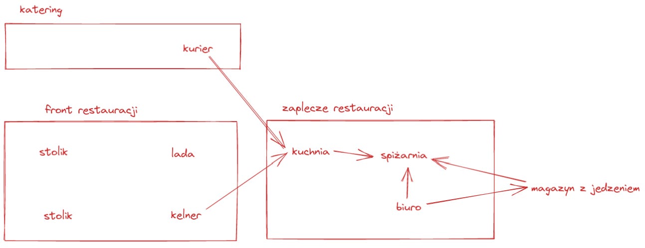 Restauracja jest podzielona na kilka funkcjonalnych części. Jest kuchnia, która przyjmuje i wydaje zamówienia. Spiżarnia, w której dostępne są produkty spożywcze, z której kuchnia pobiera składniki. Mamy biuro, które sprawdza, czy w spiżarni jest wystarczająco dużo rzeczy. Jeśli czegoś brakuje, zamawiają coś od innego dostawcy.