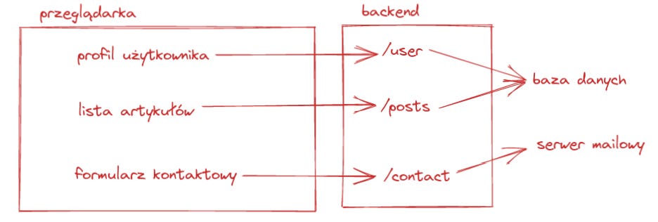Podobnie w przypadku naszych aplikacji internetowych, robimy prostą rzecz np. wypełniamy formularz i przesyłamy dane, a całą złożoność związaną z wysyłaniem maila, dodawaniem posta na blogu chowamy za zapleczem, na backendzie. Komunikujemy się jedynie z tym, co backend nam udostępnia - interfejsem api. Post o interfejs api w trakcie tworzenia.